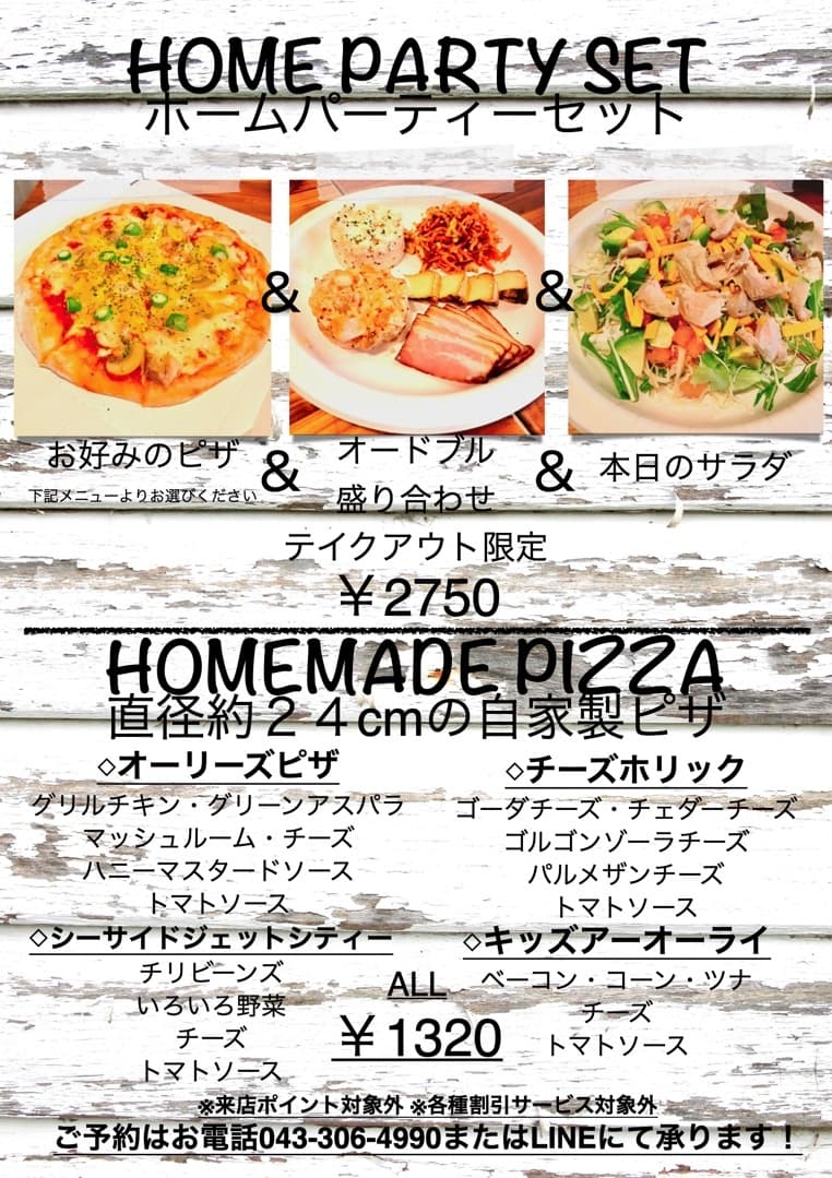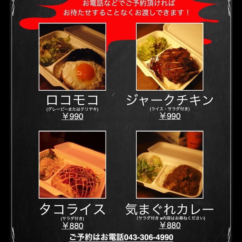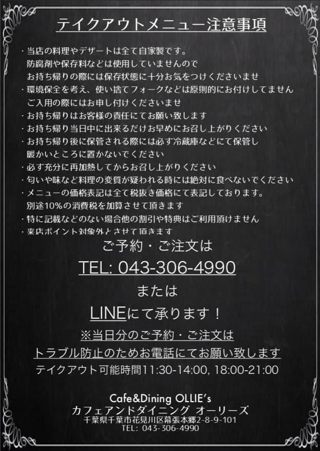 TAKEAWAYテイクアウトメニュー 当店のお料理をご自宅で!オフィスで!ちょっとしたお土産に!お持ち帰り頂けますお電話にてご注文頂ければお待ち頂く事なくお渡しすることができます!ご予約は↓のお電話にて承ります043-306-4990 クリックすると大きくなります クリックすると大きくなります クリックすると大きくなります クリックすると大きくなります クリックすると大きくなります